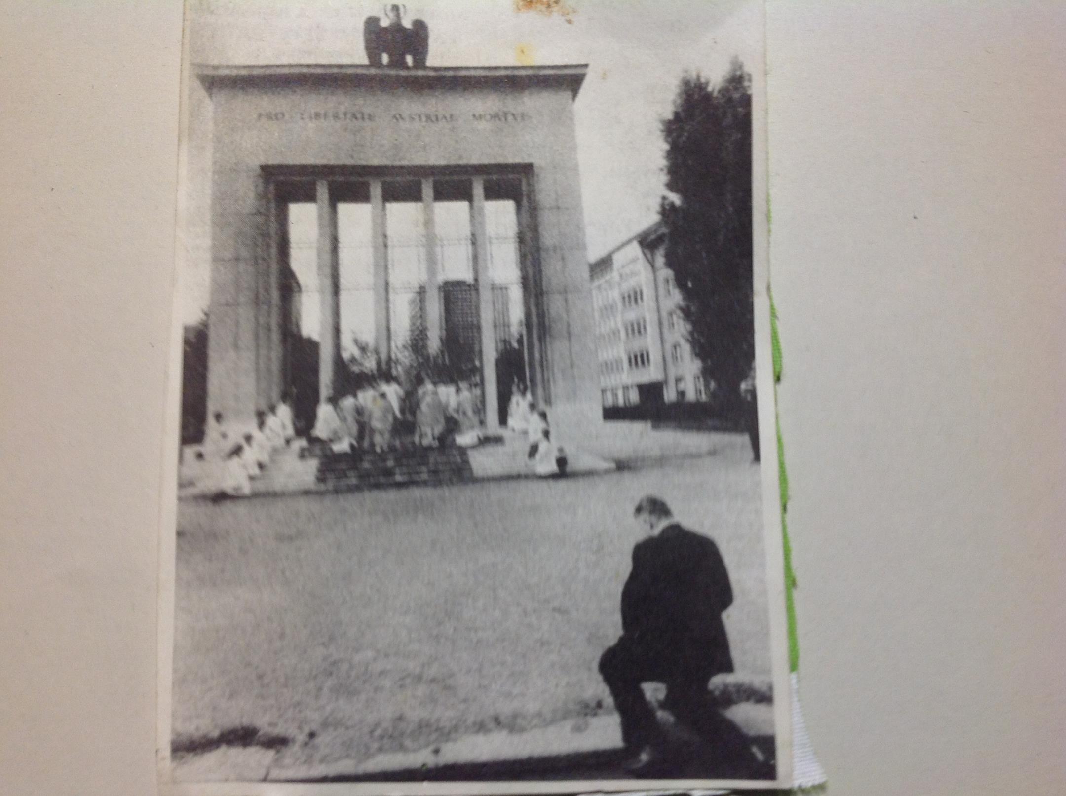 Hier kniet Hr. Eduard Wallnöfer vor dem Befreiungsdenkmal und denkt sich mal: –( „ich regle das mal auf meine Art und Weise- und übertrage grundlos den Tiroler Bürgergrund – meiner Familie und dem Bauernklientel“?