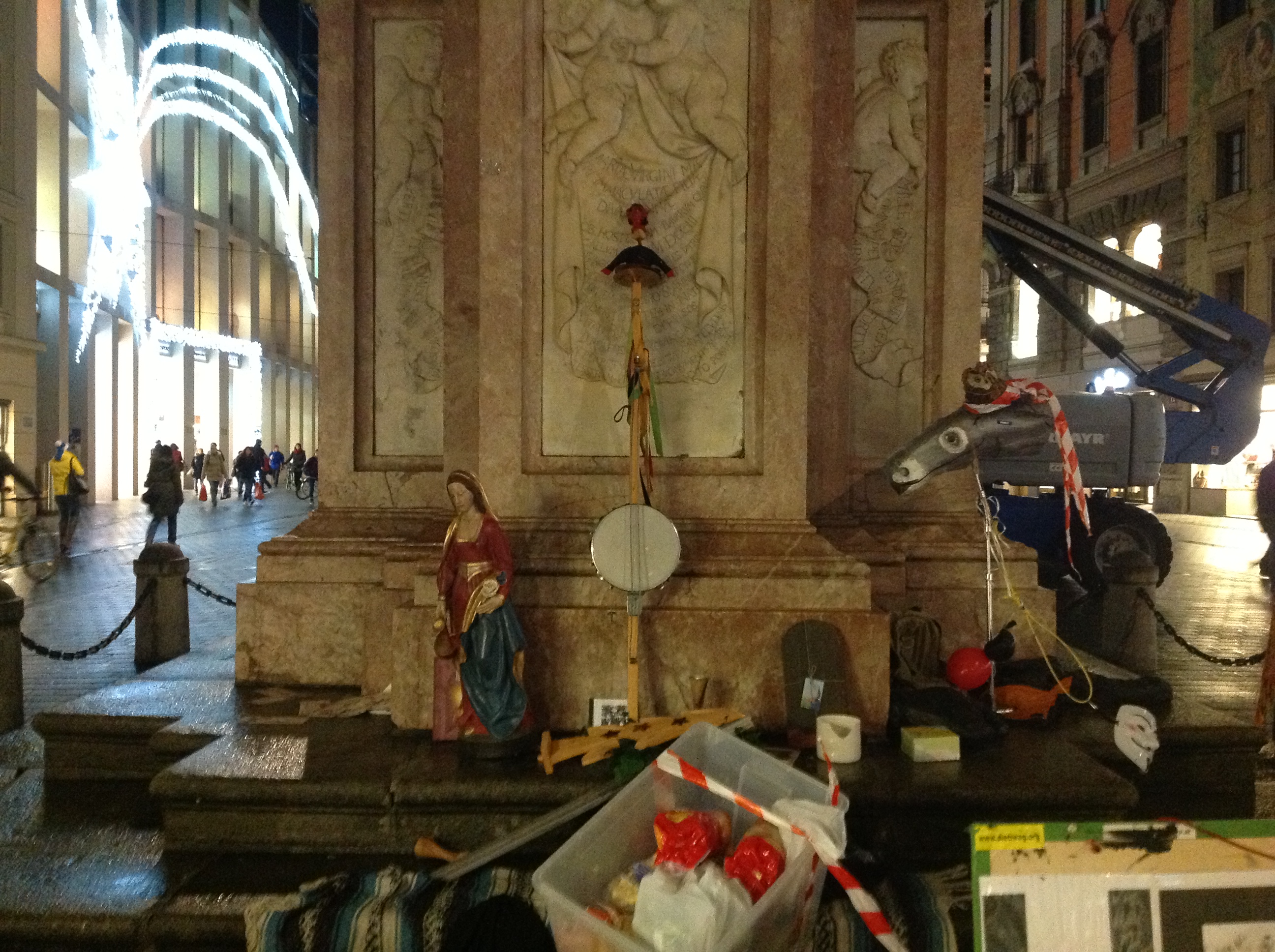 Nachdem den ganzen Tag sich das Bild des Projektes verändert wird (manchmal URPLÖTZLICH – aus heiterem Himmel – passiert – im Szenenbild etwas!), sollte man als Mensch/Passant/Ignorant auch beim zweiten Mal beim frequentieren eines Kreativ-Provokation-Protest-Versammlungsortes (beim Passieren) nochmals genau schauen! Dies sind keine zweidimensionalen Bilderrätsel – NEIN ein dreidimensionaler Aufmerksamkeits-Übungsplatz! Bewusstheit anstatt WEGSCHAUEN und URTEILEN ist dem Gemeinwohl orientiert ausgerichtet!  (hier: Ab- und Vorurteilen! Sich über die Ärmeren stellen …) Oder glauben Sie nicht? Glaubst Du nicht? (Vorurteil!)