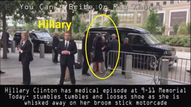 IDEO SHE DOESN’T WANT YOU TO SEE- ACTUAL FOOTAGE OF HILLARY FALLING- AND HER MINIONS BLOCKING PROOF SHE IS VERY ILL (BOTH PHYSICALLY AND MENTALLY) Hillary Clinton has medical episode at 9-11 Memorial Today- stumbles tumbles and looses shoe as she is whisked away on her broom stick motorcade – Karma you cant kick it away no many how many demons she worships- a law like natural law can’t ever be bought or rigged… UPDATE 12:05 PM. The Clinton Campaign has confirmed Hillary Clinton had to leave 9/11 ceremony due to illness. Her campaign says Hillary Clinton overheated during 9/11 ceremony and went to her daughter’s apartment to rest. However new VIDEO OF HILLARY FALLING INTO THE VAN shows a very ill woman who can barely function.