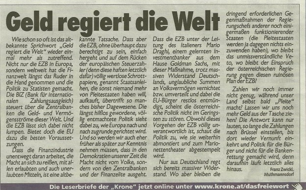 Wie schon so oft ist das altbekannte Sprichwort „Geld regiert die Welt“ wieder einmal mehr als zutreffend. Nicht nur die EZB in Europa, sondern weltweit hat die Finanzwelt längst das Ruder in die Hand genommen und die Politik zu Statisten gemacht. Die BIZ (Bank für internationalen Zahlungsausgleich) steuert über die Zentralbanken die Geld- und Vermögensströme dieser Welt. Und die EZB lässt sich dabei nicht lumpen. Bietet doch die EU dazu die besten Voraussetzungen. Dass die Finanzindustrie unentwegt daran arbeitet, die Macht an sich zu reißen, mit allen erlaubten und auch unerlaubten Mitteln, ist eine altbekannte Tatsache. Dass aber die EZB, ohne überhaupt dazu berechtigt zu sein, einfach hergeht und auf dem Rücken der europäischen Steuerzahler (denn diese haften letztlich dafür) völlig wertlose Schrottpapiere, genannt Staatsanleihen, die sonst niemand mehr von Pleitestaaten haben will, aufkauft, übertrifft so manches bisher Dagewesene. Die längst hilflos gewordene, völlig entmachtete Politik sieht dabei zu, wie Europa nach und nach zugrunde gerichtet wird. Und so werden wir auch eher früher als später zur Kenntnis nehmen müssen, dass in den Demokratien unserer Zeit die Macht nicht vom Volke, sondern von den Zentralbanken und der Finanzelite ausgeht. Dass die EZB unter der Leitung des Italieners Mario Draghi, einem gelernten Investmentbanker aus dem Hause Goldman Sachs, mit dieser Maßnahme, trotz massiven Widerstand Deutschlands, unglaubliche Summen an Volksvermögen vernichtet bzw. umverteilt und dabei die EU-Bürger restlos entmündigt, scheint die österreichische Politik nicht im Geringsten zu stören. Obwohl dieses Vorgehen der EZB völlig unverantwortlich ist, schaut die Politik zu, wie sie weiterhin abmontiert und zum Marionettentheater abgestempelt wird. Nur aus Deutschland regt sich bereits massiver Widerstand. Wo aber bleiben die dringend erforderlichen Gegenmaßnahmen der Regierungschefs anderer noch einigermaßen funktionierender Staaten (die Pleitestaaten werden ja dagegen nichts einzuwenden haben), wo bleibt das unmissverständliche Veto, wo bleibt der Einspruch der österreichischen Regierung gegen diesen ruinösen Plan der EZB? Zahlen wir noch immer nicht genug, während unser Land selbst bald „Pleite“ macht? Lassen wir uns noch mehr Geld aus der Tasche ziehen? Die Antwort kann nur lauten, so lange die Zahlungen nach Brüssel einstellen, bis dort wieder Vernunft einkehrt und Politik für die Bürger und nicht für die Bankenrettung gemacht wird, denn daraufhin läuft letztlich alles hinaus.
