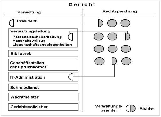 Aufgaben und Befugnisse innerhalb eines Gerichts sind streng getrennt in Aufgaben der Rechtsprechung und Verwaltungsaufgaben (Abbildung 4). Der Präsident (Direktor) hat eine Doppelfunktion: er leitet die Verwaltung und er ist auch als Richter in der Rechtsprechung tätig. Je größer das Gericht und je höher die Stellung des Gerichts in der Verwaltungshierarchie, desto mehr Verwaltungsanteile hat der Präsident und umso intensiver ist der Kontakt zum Ministerium.