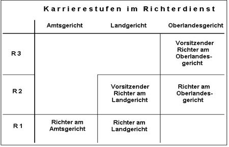 Richter werden in der sog. R-Besoldung eingruppiert. Es gibt nur wenige Stufen, mithin nur wenige Karrieremöglichkeiten für die reine Rechtsprechungstätigkeit. Die erste Beförderungsstufe führt zum Vorsitzenden Richter am Landgericht oder zum Beisitzer am Oberlandesgericht, die zweite Beförderungsstufe führt bereits zum Senatsvorsitzenden im Oberlandesgericht (Abbildung 5). Das erklärt, warum die weitaus größte Zahl der Richter in ihrer richterlichen Karriere nicht weiter als bis zum ersten Beförderungsamt aufsteigen.